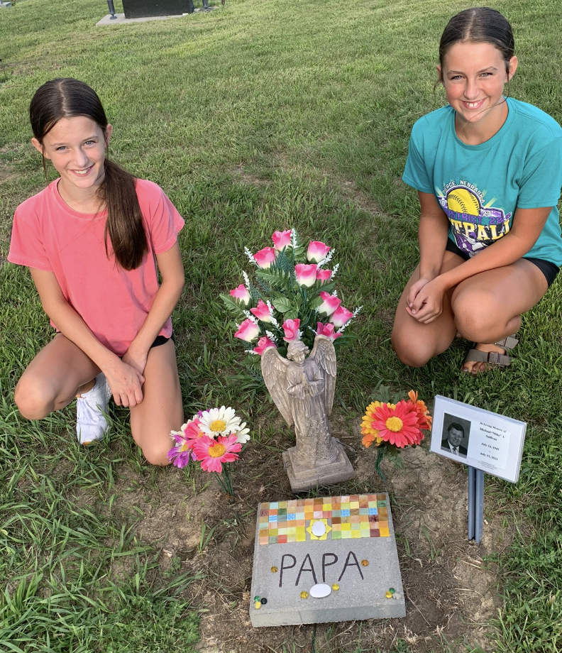 Even though the stone was available, the design and ultimate etching took a while so a temporary marker and my granddaughters’ art work marked the spot.